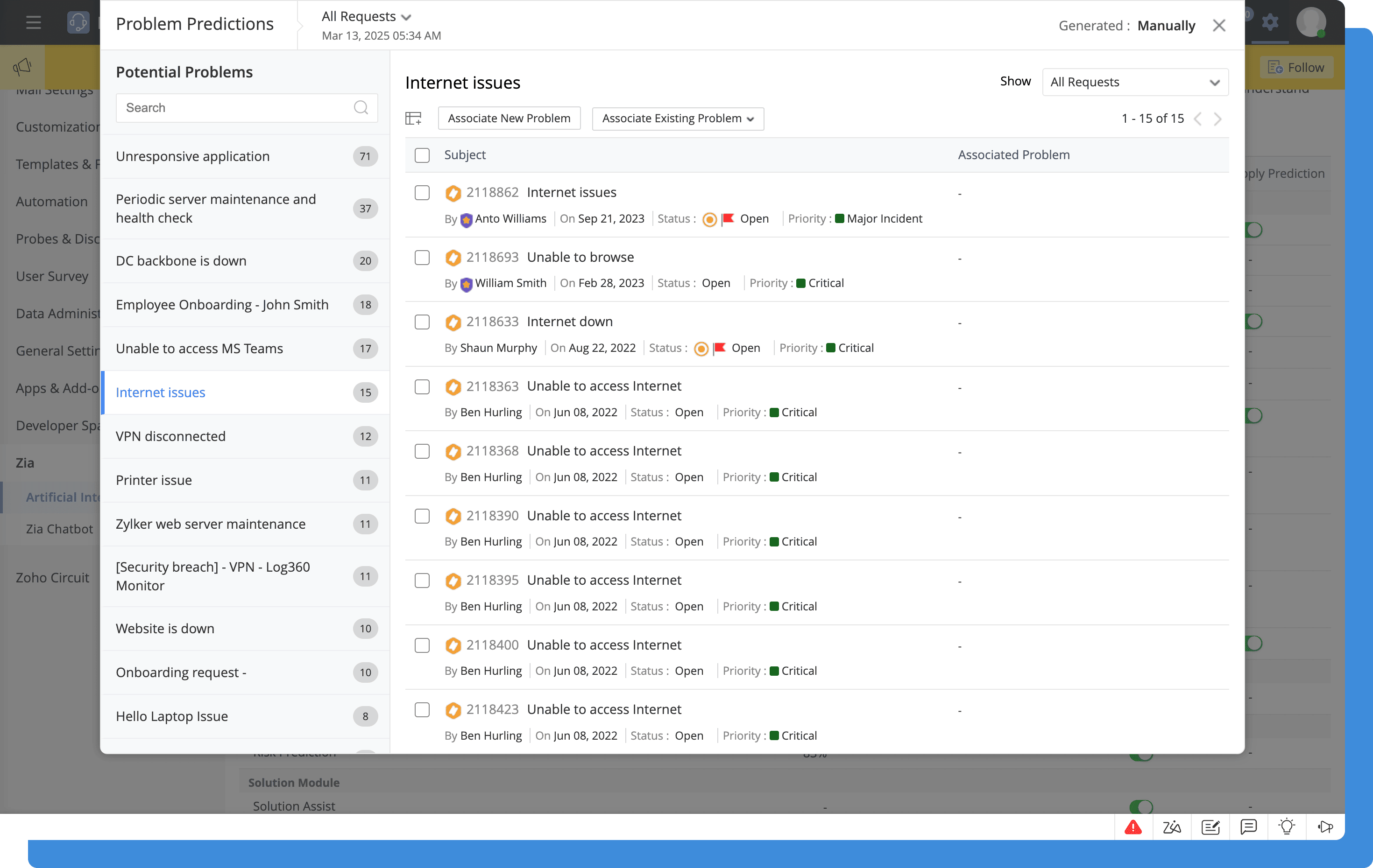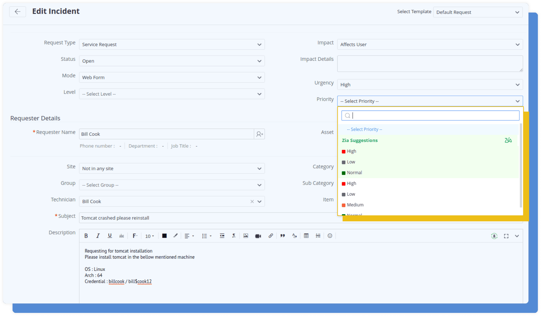 ManageEngine ServiceDesk Plus dilengkapi dengan predictive AI (Zia) yang bisa mengotomatisasi proses pemberian prioritas pada tiket. Tak hanya itu, Zia juga bisa mengklasifikasikan tiket ke kategori yang tepat dan menugaskan tiket ke teknisi yang paling relevan. Hasilnya, tiket kritis bisa ditangani lebih cepat sebelum berkembang menjadi masalah besar yang berpotensi menyebabkan downtime.