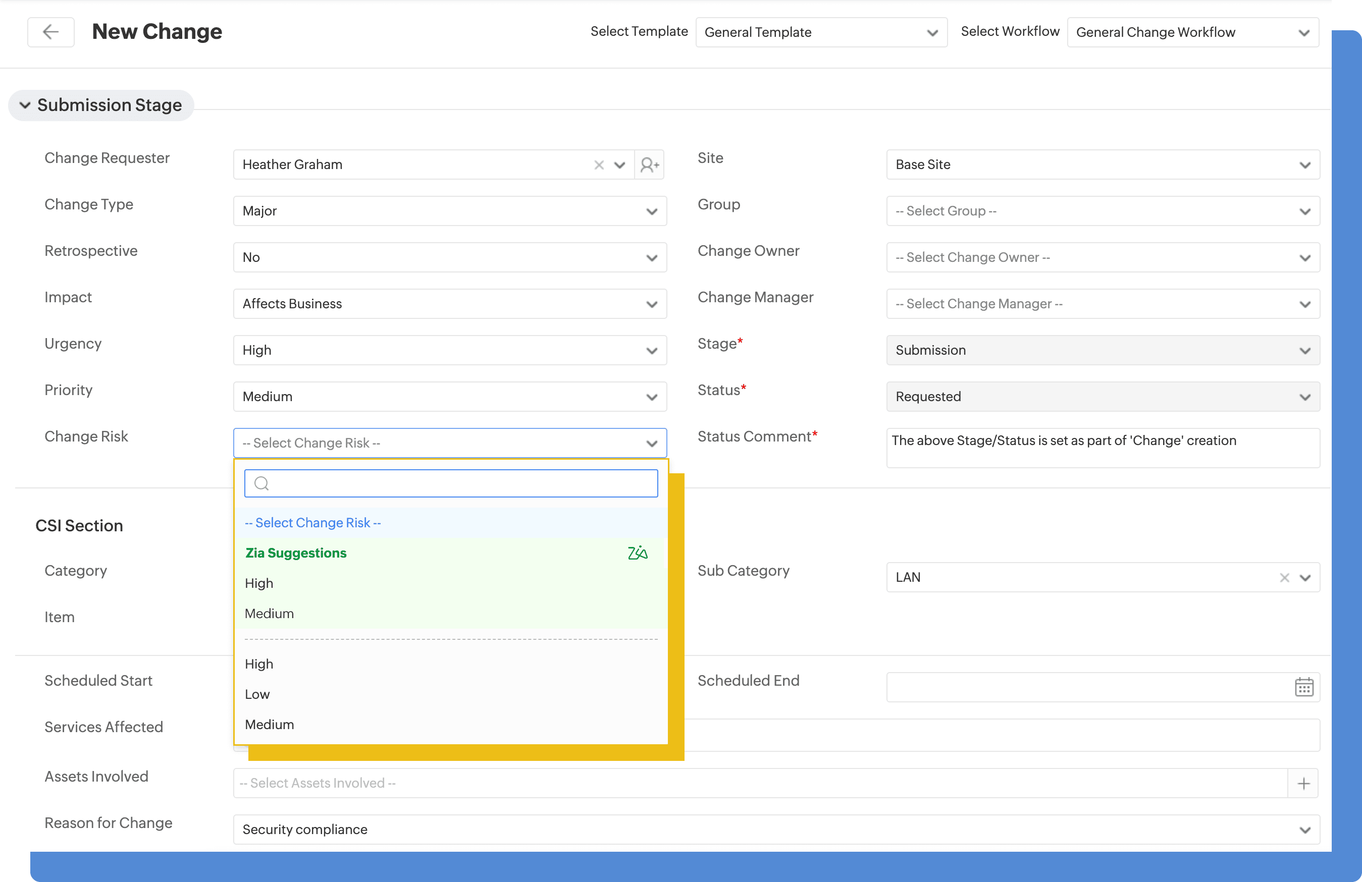 Zia, predictive AI dari ManageEngine, bisa menganalisis data historis dari perubahan dan memprediksi tingkat risiko suatu perubahan. Dengan informasi ini, tim IT bisa mengambil langkah mitigasi yang tepat sebelum perubahan dijalankan, sehingga layanan tetap stabil dan risiko downtime bisa diminimalkan.