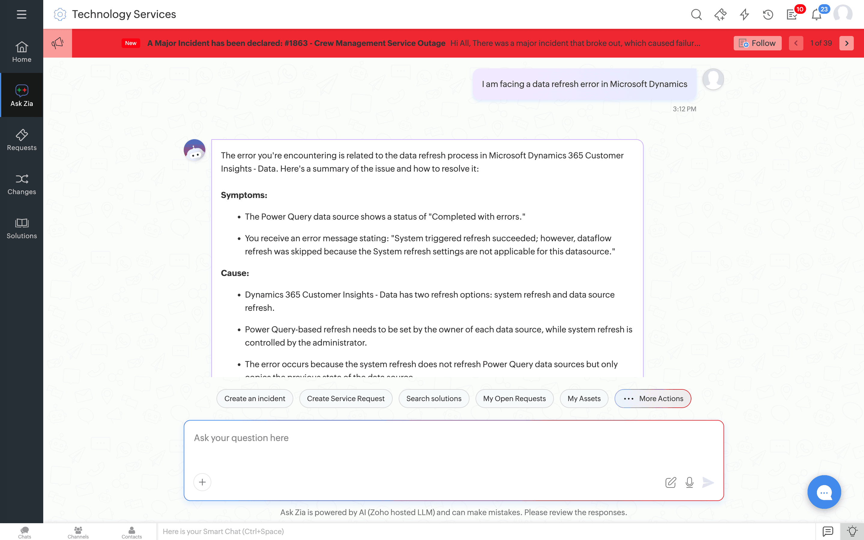 Ask Zia, conversational AI di ServiceDesk Plus, memungkinkan pengguna melaporkan masalah, meminta layanan, atau mencari solusi lewat percakapan natural. Ask Zia bisa menyediakan jawaban dari knowledge base, memandu user untuk mengatasi masalah sederhana secara mandiri, dan melakukan tindakan langsung tanpa perlu meninggalkan percakapan. Tindakan yang dimaksud misalnya assign tiket, update status, menambahkan catatan, atau menutup request. Karena semua bisa dilakukan tanpa berpindah aplikasi, masalah bisa ditangani lebih cepat dan downtime berkurang.