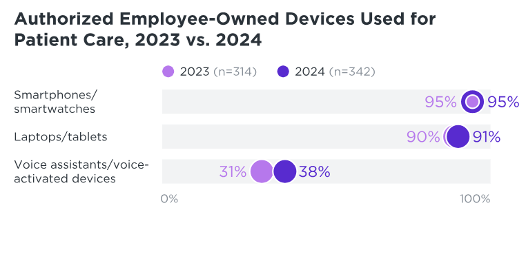 Medical practitioners use a lot of devices, ranging from clinical workstations, rounding tablets, embedded PCs attached to medical devices, and barcode based specialty devices. The Digital Health Most Wired National Trends 2024 reveals that while mobile-based point of care devices are adopted significantly, there has also been a shift to increased adoption of employee-owned devices. This indicates a preference among practitioners for a more flexible, technology-driven care environment.